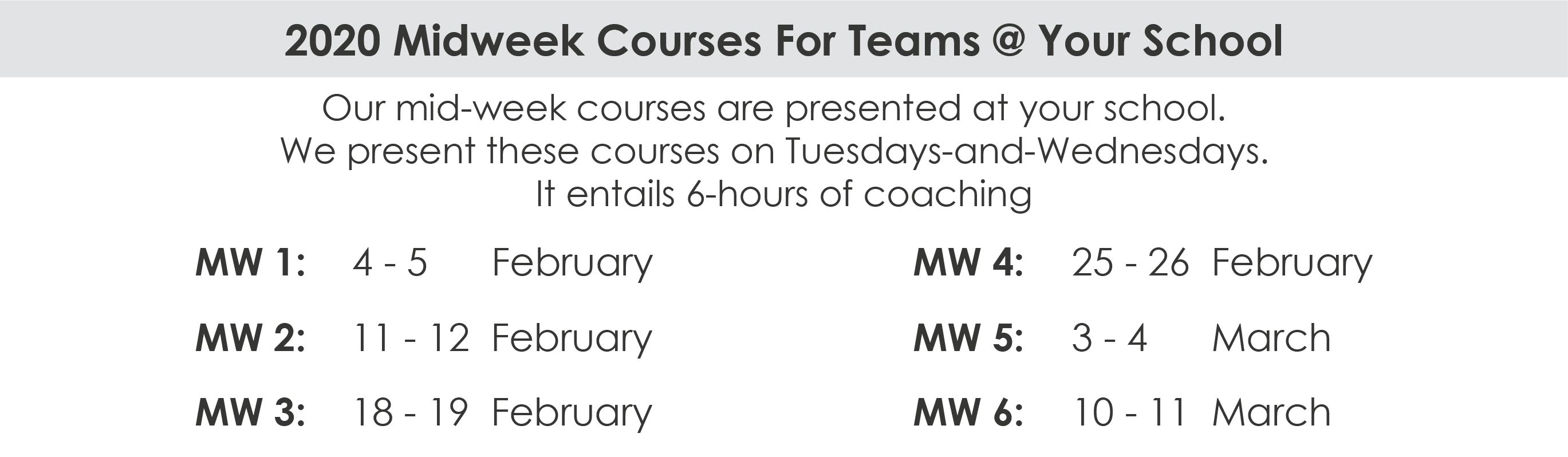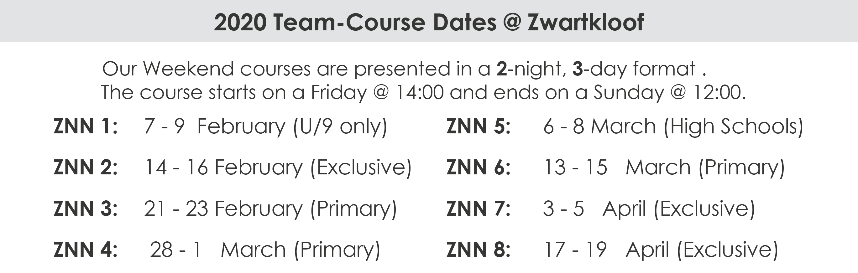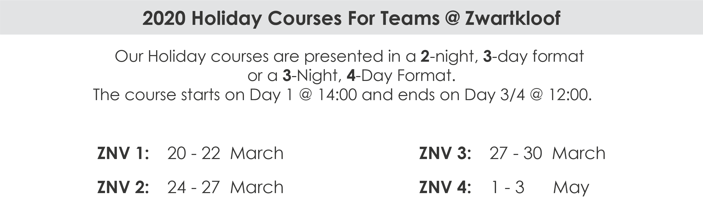 Our direct and intensive approach towards presenting our courses ensures that coaching and mentoring is personal and intimate while we continuously strive to create a warm, friendly atmosphere. The courses provide an excellent balance between coaching, help with team selections, game play, head-and-heart sessions and team building activities as well as plenty of time for fun, friends and precious memories.